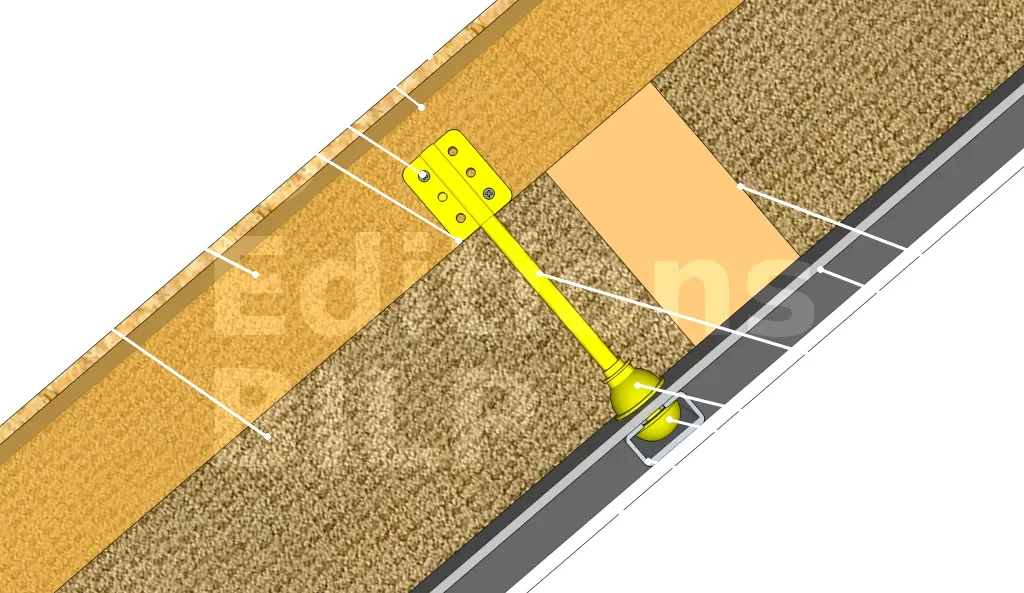 Elle est composée d’une tige, d’une clé et d’une rondelle. Elle se fixe comme les suspentes classiques. Les encoches serviront de repère pour leur fixation sur les chevrons. La tige à pour fonction d’embrocher la laine minérale sous le chevron tandis que la rondelle la maintiendra. Par la suite, la membrane d’étanchéité à l’air devra y être également embrocher avant d’être verrouiller par la clé où l’on éclipsera la fourrure. Pour finir, il suffira d’y fixer les plaques de plâtre.