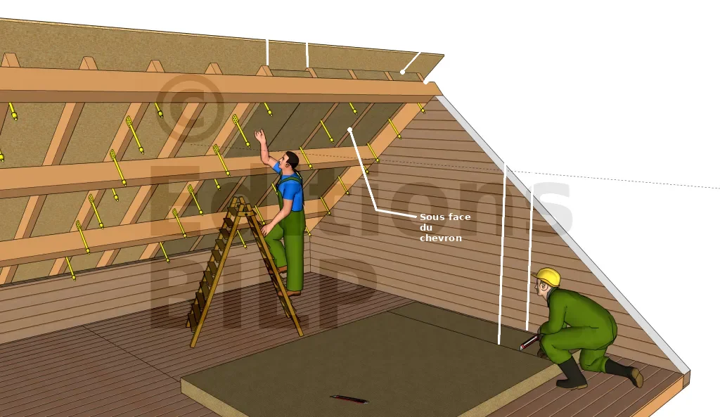 Si vous avez un écran de toiture en HPV (Haute Perméabilité à la vapeur), l’isolant peut être placé en contact de la toiture. Cependant, si ce n’est pas le cas ou si vous avez des doutes sur le type de votre écran de toiture, il vous sera indispensable de laisser une lame d’air de 2 cm en sous face de l’écran.