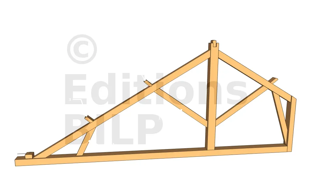 Dans le cas d’une ferme tronquée avec un arbalétrier de très grande longueur qui supporte deux pannes intermédiaires, la contrefiche va être positionnée à l’une de ses extrémités sur l’entrait et à l’autre extrémité au-dessous de l’arbalétrier, au niveau de la deuxième panne intermédiaire.