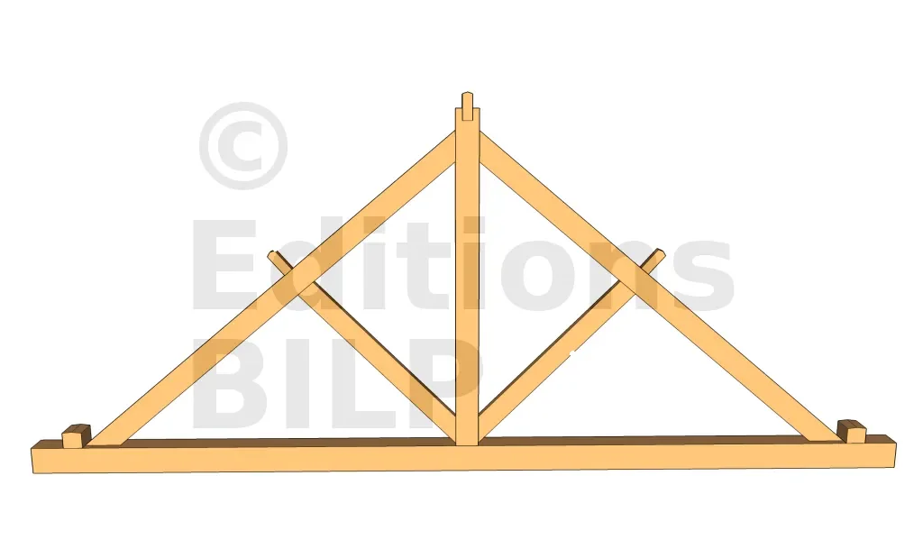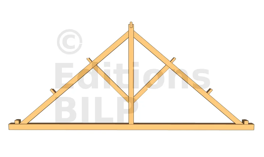 Dans le cas où l’arbalétrier supporte deux pannes intermédiaires, la contrefiche sera positionnée sous la première panne, à savoir la panne qui va suivre le poinçon. Contrairement au cas précédent, dans ce cas ci, l’une des extrémités de la contrefiche ne se trouvera pas au niveau de la partie basse du poinçon mais un peu en hauteur.