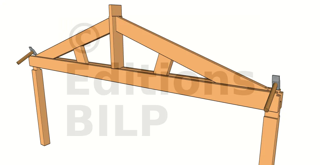 - frapper l’ensemble sur les hauts de l’entrait. L’action simultanée permet d’éviter l’inclinaison de la ferme et ainsi d’avoir à refaire le procédé depuis le début.