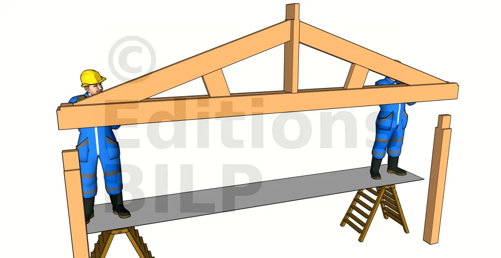 Cette technique est utilisée pour fixer l’entrait moisé sur les poteaux. Si l’assemblage de la ferme se fait pièce par pièce, la technique de pose pour panne moisée convient pour fixer l’entrait moisé sur les poteaux. Vous aurez ensuite à fixer une par une chaque pièce (poinçon, contrefiches et arbalétriers).