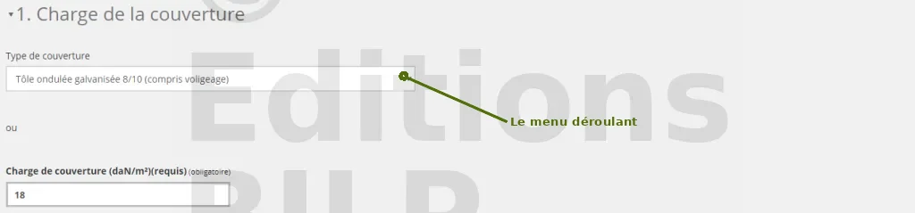 Dans le menu déroulant, vous pouvez sélectionner votre type de couverture. Sur notre exemple, la toiture sera en tôle ondulée 8/10.