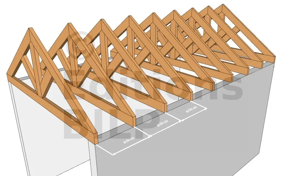 Les fermes de notre exemple sont disposées sur les murs avec un entraxe de 60cm. Elles reçoivent directement la couverture, sans isolation.
