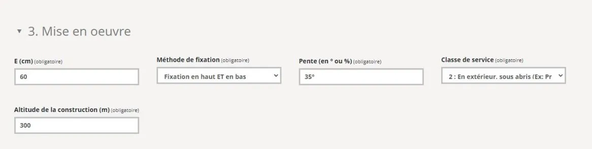 La construction est localisée à Isère avec une altitude de 300m et elles seront en extérieur et sous abris (classe de service = 2).