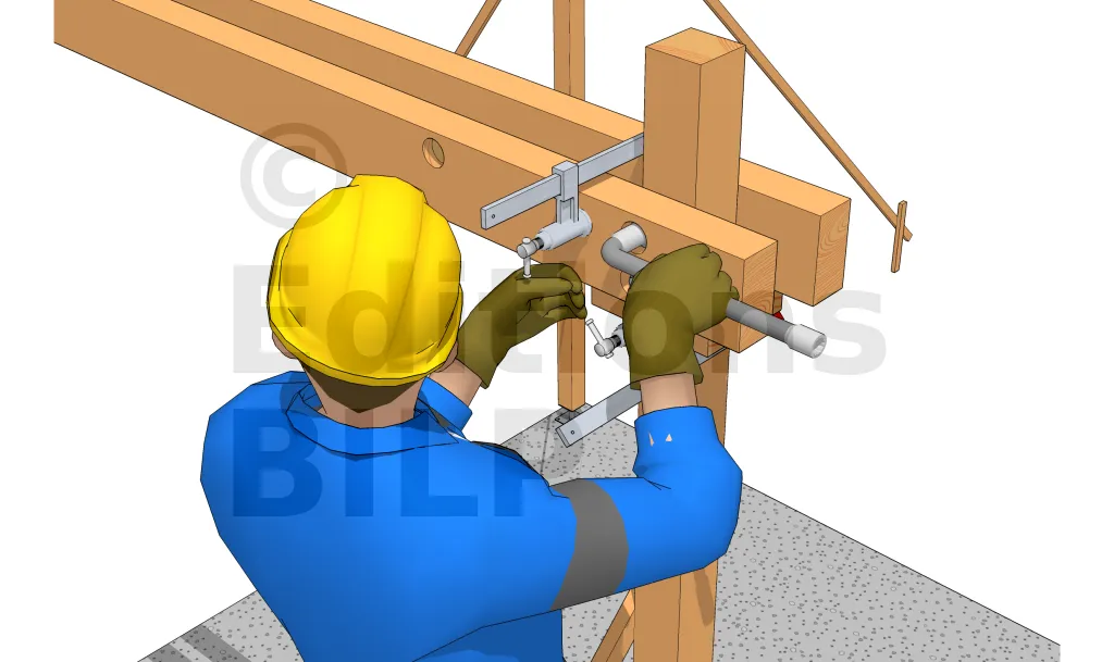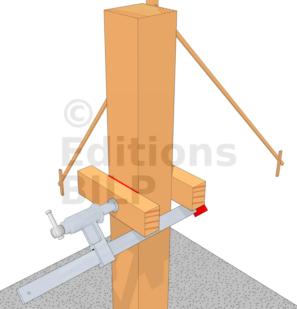 A l’aide d’un serre-joint, fixer deux tasseaux de part et d’autre des deux faces du poteau sous les traits de repère du poteau. Faire de même pour l’autre poteau.