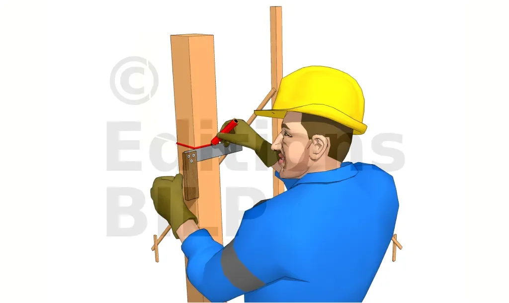 Mesurer, à partir du haut du poteau, la face inférieure de la panne. Tracer ensuite avec une équerre ce repère sur toute la largeur du poteau.