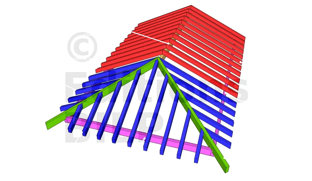 Les chevrons (en rouge) couvre la distance entre la panne faîtière (en jaune) et la panne sablière (en rose). Les arêtiers (en vert) sont connectés à la faîtière en formant en angle où les deux plans de la toiture se rejoignent. Les empannons (en bleu) sont des chevrons coupés qui courent des arêtiers à la sablière.