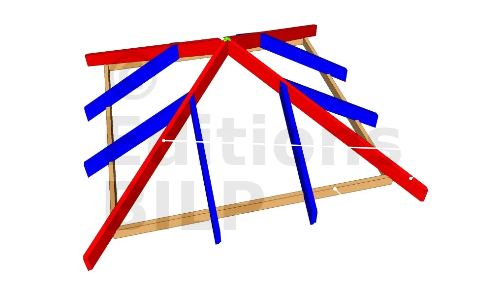A la différence de la toiture rectangle à croupes, la toiture carrée à croupes comporte moins d’éléments. Les arêtiers (en rouge) se rejoignent au sommet afin de donner quatre pans de toiture. Ainsi, la jonction au sommet se fait à l’aide d’une clé de toiture (en vert). Les empannons (en bleu) sont fixés sur les arêtiers afin d’alléger les charges transmises sur ces derniers. Les empannons courent des arêtiers à la traverse.
