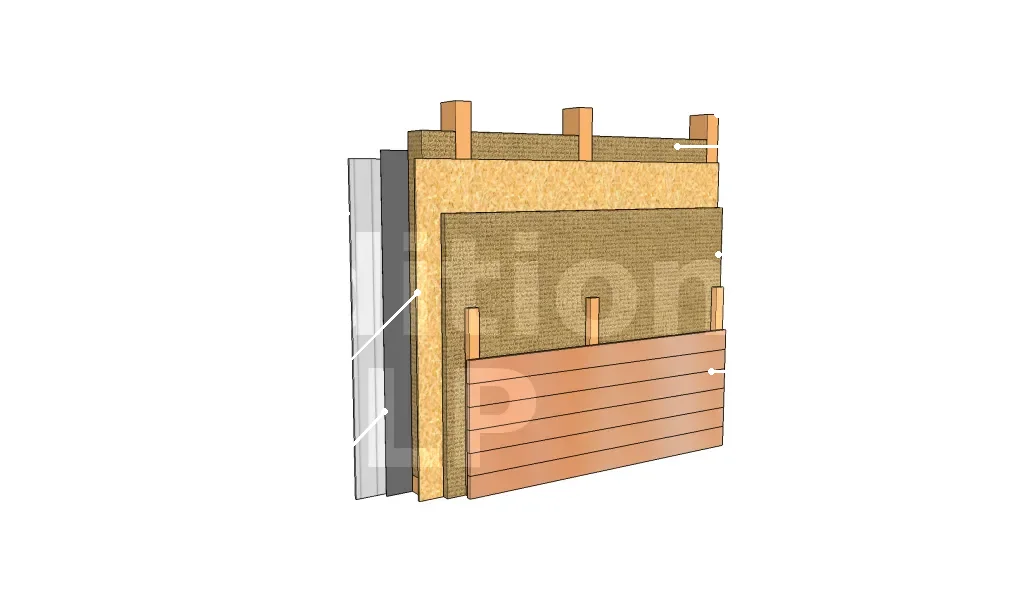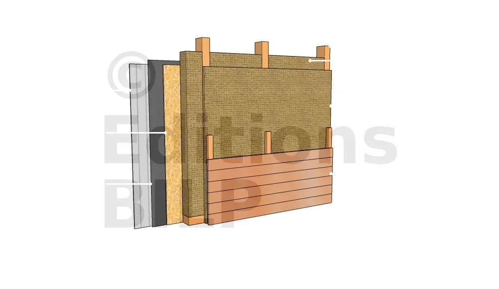 Les parois avec une double isolation et complément d’isolation par l’extérieur se diffèrent par la position du voile de contreventement et la nécessité ou non d’un pare-pluie rigide sur le côté extérieur. En effet, le voile de contreventement peut se trouver du côté intérieur ou entre les deux isolants. La fonction de pare-pluie est assurée par l’isolant secondaire extérieur dans le cas où cet isolant n’est pas soutenu par une ossature secondaire.