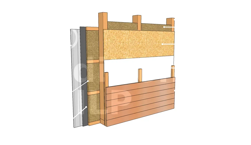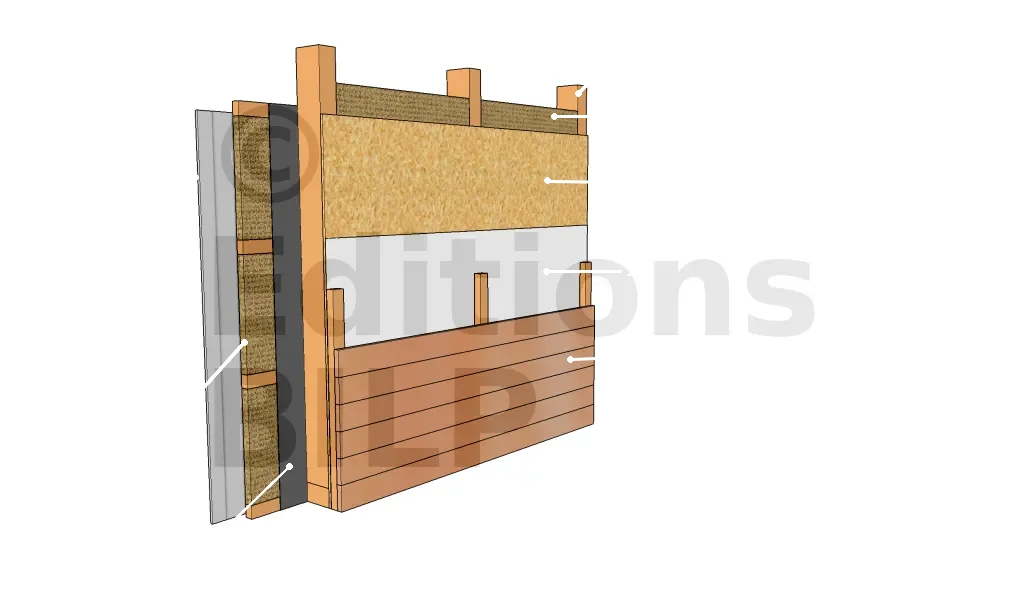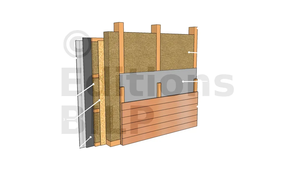 Les parois avec une double isolation et complément d’isolation par l’intérieur se diffèrent par la position du voile de contreventement, du pare-vapeur et de la nécessité ou non d’un pare-pluie rigide sur le côté extérieur. En effet, le voile de contreventement peut se trouver sur le côté extérieur ou entre les deux isolants. Le pare-vapeur peut être entre les deux isolants ou sur le côté intérieur. Si le panneau de contreventement se situe entre les isolants, il est nécessaire d’avoir recours à un pare-pluie rigide.
