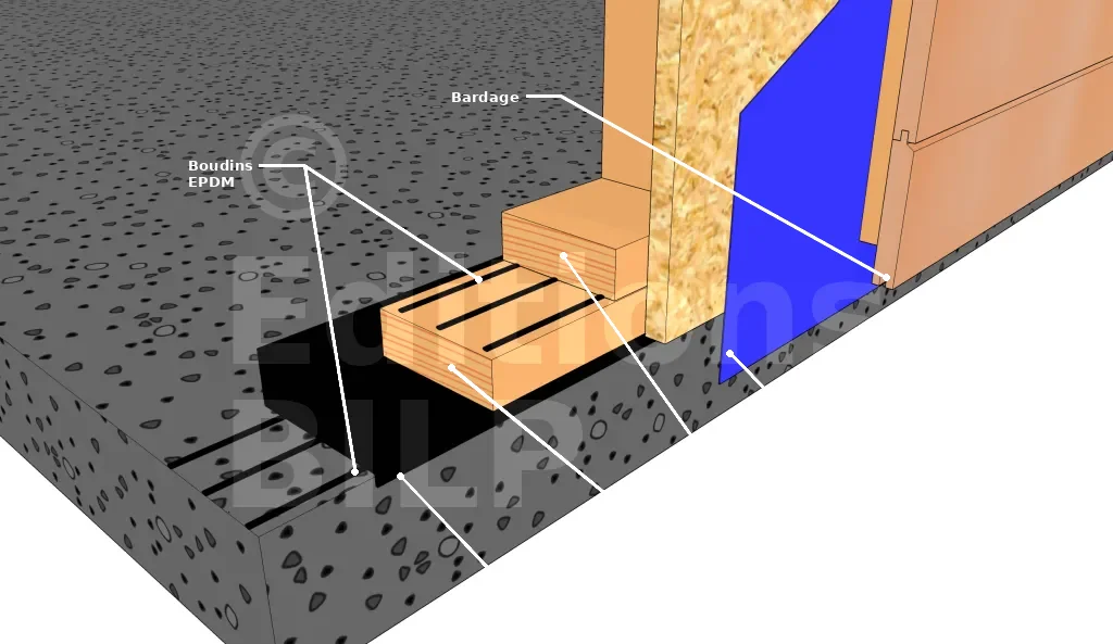 D’une manière générale, la lisse basse doit se situer à 20 cm au-dessus du terrain fini au moins. Pour éviter toutes remontées capillaires et une dégradation prématurée de celle-ci, il est indispensable d’éviter le contact direct du bois et de la maçonnerie en y intercalant des bandes d’arases. Pour ce faire, il faudra que cette bande soit assez large pour pouvoir être relevée sur le côtéTEXTE APRES GLOBAL