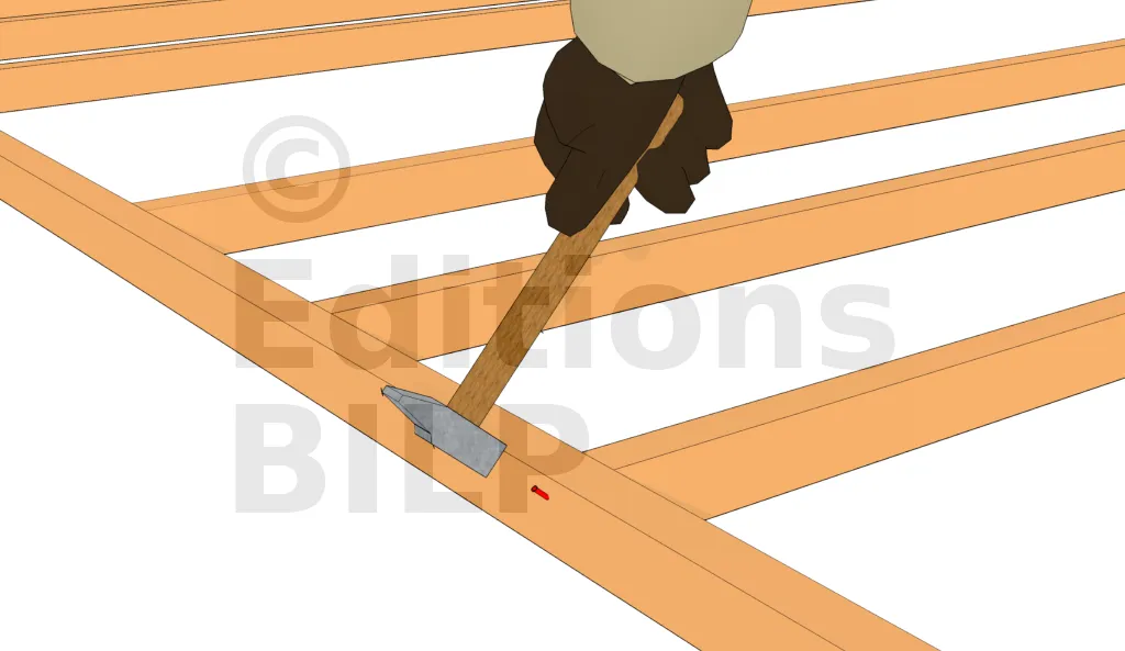 Lorsque les marquages sont effectués, il est temps de fixer les montants. Le clouage est la méthode traditionnelle utilisée par les charpentiers. Il est soit manuel, soit réalisé à l’aide d’un cloueur pneumatique. Mais pour l’amateur, les vis sont plus faciles à mettre en œuvre et l’assemblage est aussi plus solide.