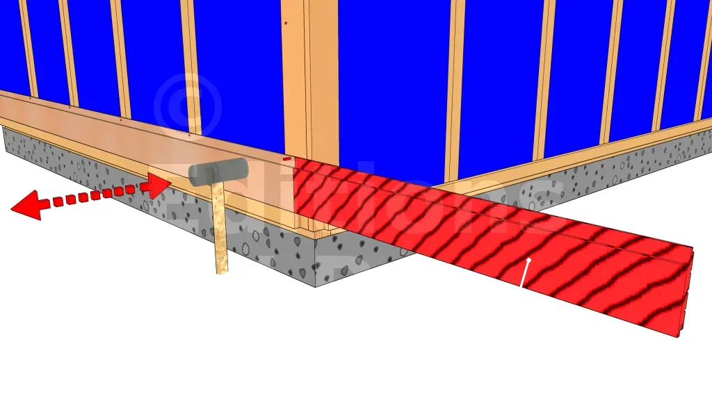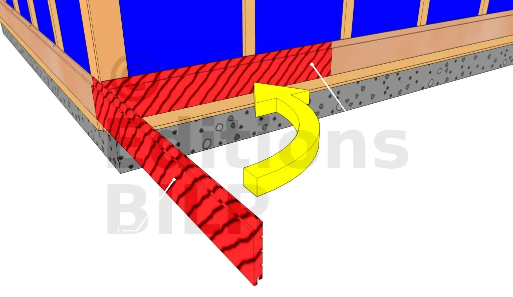Une baguette de départ est utile (mais pas indispensable) pour une bonne pose de bardage. Elle doit être placée perpendiculairement aux montants d’ossature. Clouez la baguette et vérifier son horizontalité. Le clouage doit se faire en deux temps, c’est-à-dire que vous finissez d’enfoncer totalement les clous qu’après vérification des niveaux.