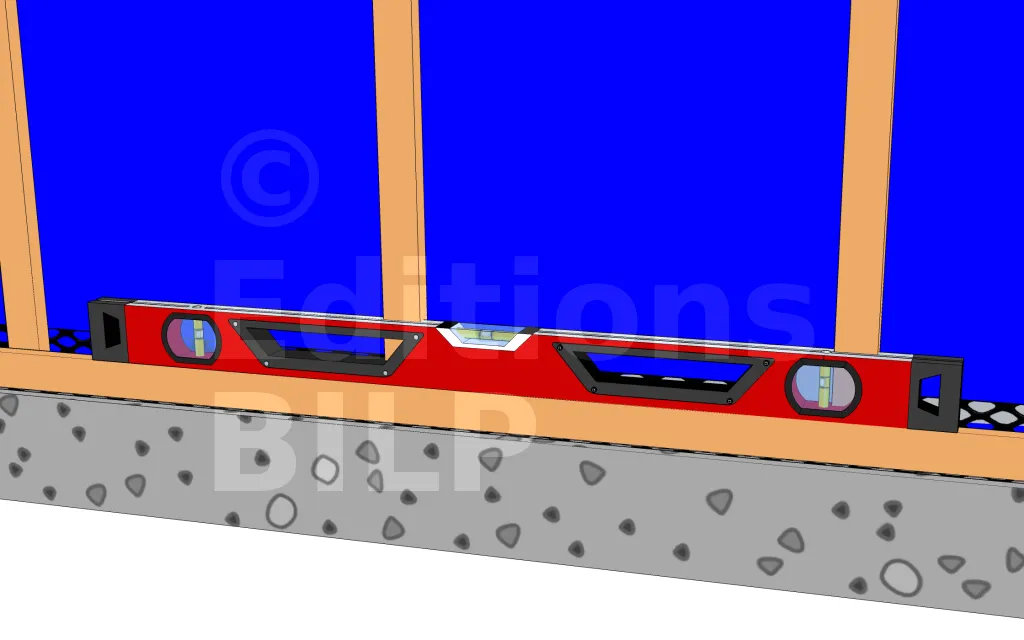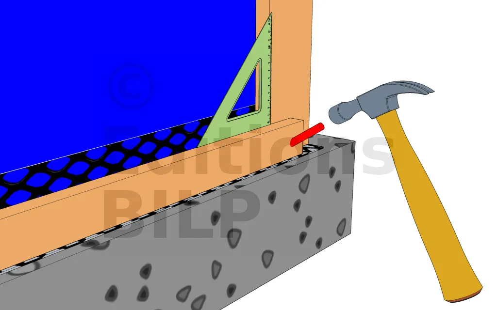 Tracer une ligne de niveau à 15cm du sol grâce à un cordeau ou une grande règle de maçon. Bien s’assurer de l’horizontalité car cette ligne sert de référence pour toute la suite. Placer la grille juste au dessus de la ligne puis fixer.