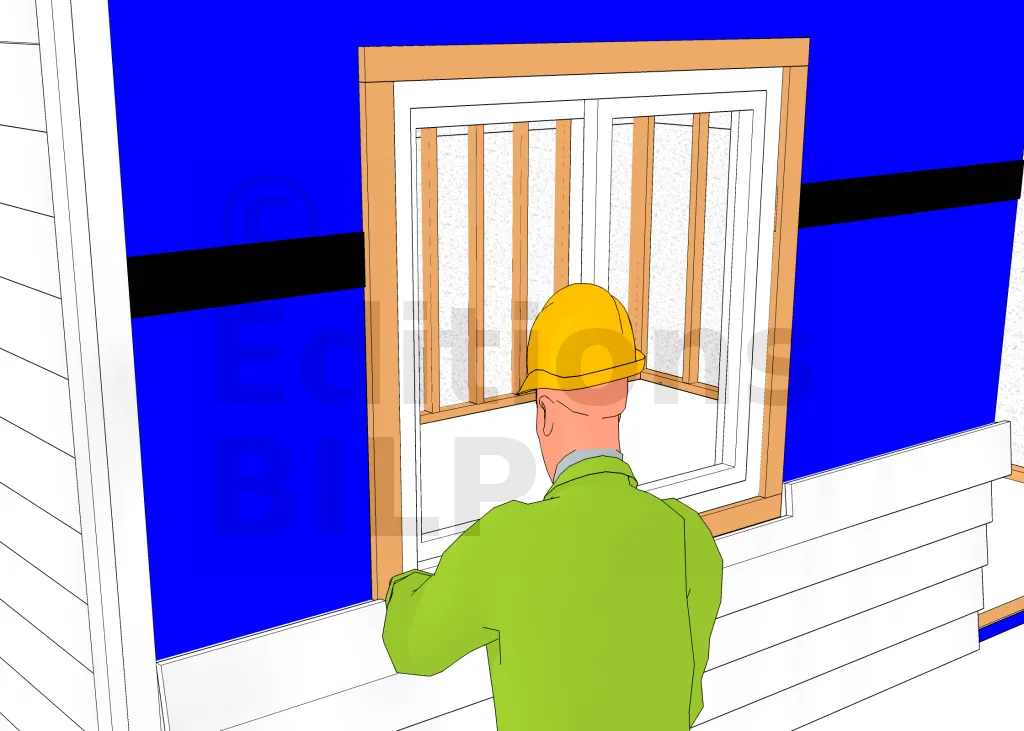 Pour les cas des ouvertures comme les portes ou les fenêtres, on ne pose pas de bardage sur les cadres pour éviter l’infiltration d’eau. Bien ajuster donc les planches de bardage au niveau des ouvertures. Coupez les planches de telle sorte qu’elles embrassent bien la forme des portes et fenêtres. La dernière pose de bardage en dessous de la fenêtre se fait avant le bout de l’appui (appelé aussi la goutte d’eau) pour l’évacuation d’eau.