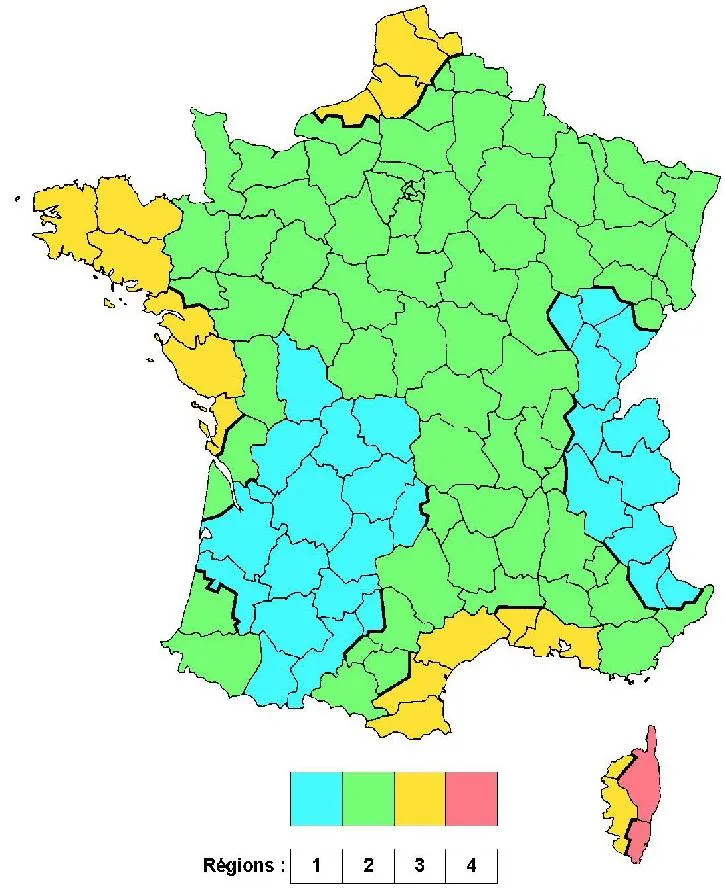 La répartition des régions de vent (zones) est donnée par la carte suivante tirée de l’Eurocode1 EN1991-1-4.