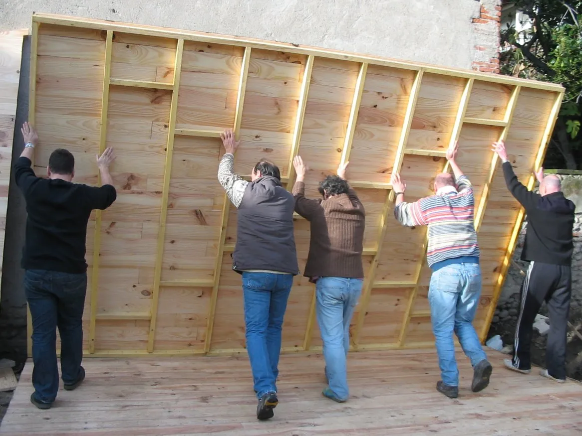 Lorsque le montage du pan de l’ossature est effectué, il est temps de le lever, avec l’aide d’un proche, ou plusieurs selon la dimension de l’ossature. Il est essentiel d’aligner parfaitement la lisse sur le support (dalle, plateforme, etc.).