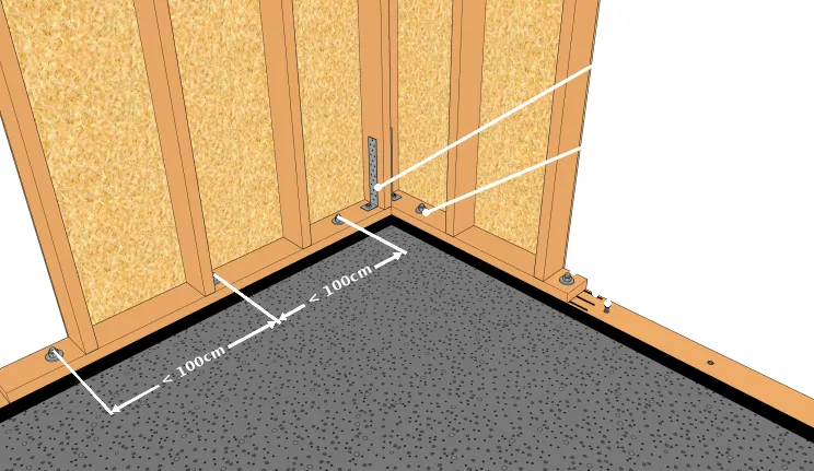 Etant donné que les charges verticales (la gravité) et les forces horizontales (le vent) devront être transmises de la traverse basse sur la lisse basse et par la suite de la lisse basse vers la dalle en béton, il est primordial de bien choisir la méthode de fixation à utiliser.