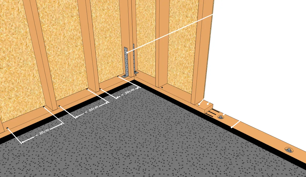 Dans cette technique, on fixe d’abord la lisse basse, puis les pans de mur sur cette dernière. De ce fait, il faut que les lisses basses aient été fixées avec des goujons d’ancrage, des tirefonds + chevilles ou par scellement chimique des tiges filetées.