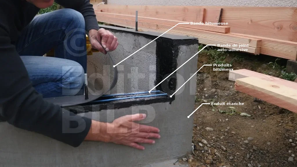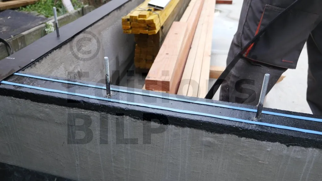 Comment éviter le contact direct du bois avec la maçonnerie ?mardi 25 novembre 2025bruno, John, Saphir PropitechQuelques techniques pour protéger les bois contre les remontées capillaires et les infiltrations d’eaux.TEXTE AVANT GLOBALLes composantsEtanchéification terminéePose des bandes de joints auto-adhésives Enduisez le muret de soubassement de mortier étanche. Appliquez un produit bitumeux sur le béton pour éviter la remontée capillaire. Posez les bandes de joints auto-adhésives.Pose des bandes bitumeuses Repérez les emplacements des tiges filetées et marquez-les sur les bandes. Faites des trous puis posez les bandes.Voici une vidéo sur la réalisation de cette étape :TEXTE APRES GLOBAL