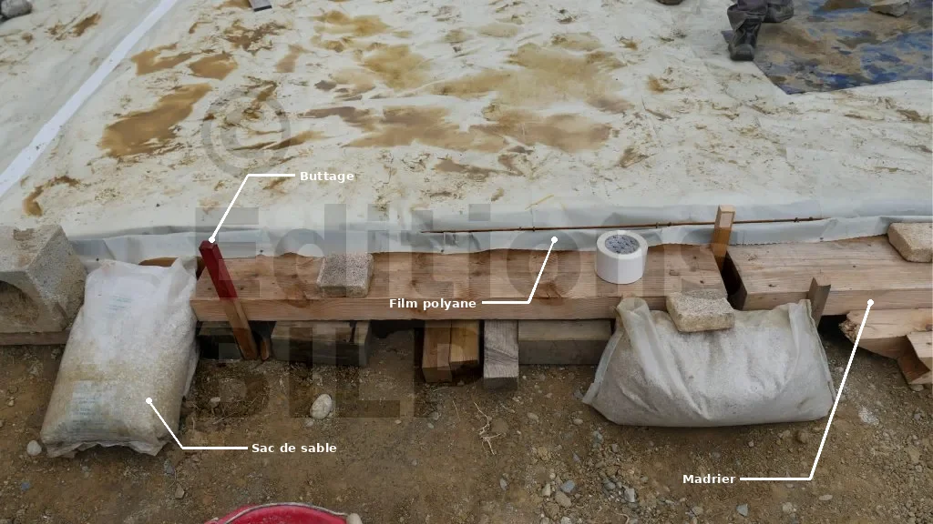 - Mise en place des madriers et/ou des sacs de sable contre le coffrage pour renforcer le buttage.
