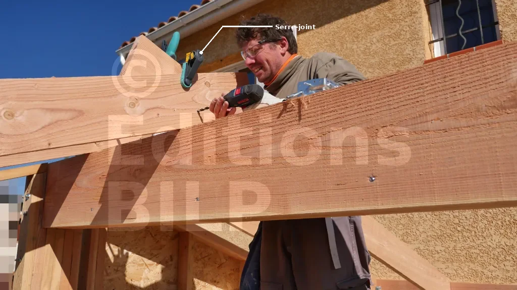 Afin de réaliser le perçage des deux chevrons en un seul passage, il est nécessaire de fixer les deux chevrons à l’aide de serre-joint avant de procéder au perçage.