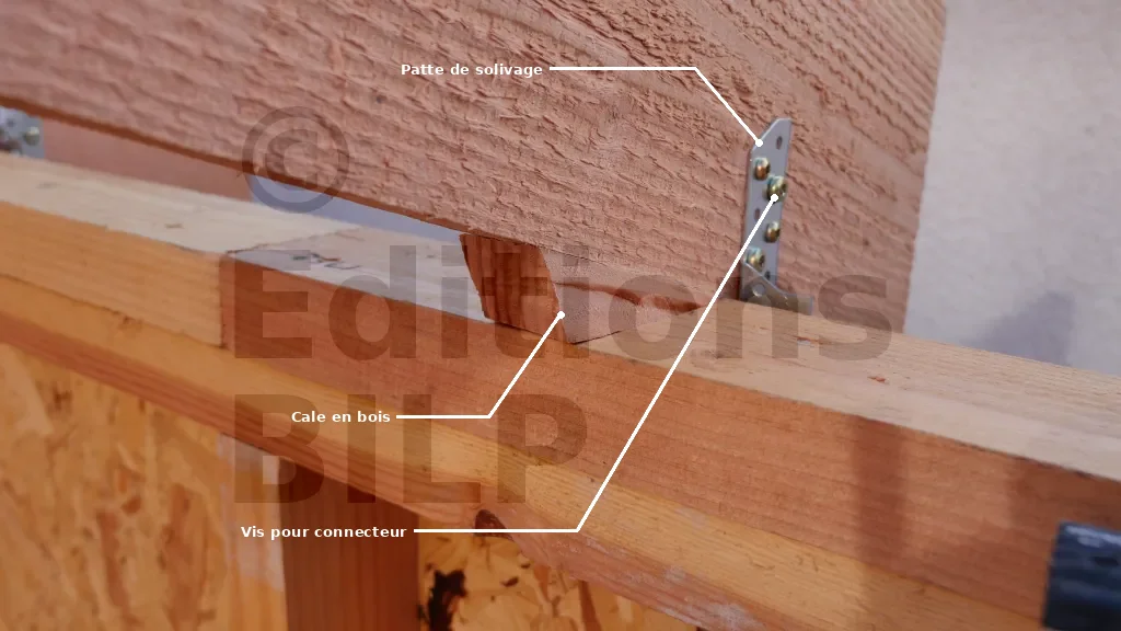 Pour mieux répartir la charge d’appui, il est nécessaire d’insérer des cales en bois coupées en sifflet entre les chevrons et la lisse d’ossature. Cela afin d’éviter que les vis pour connecteur ne supportent toute la charge de la toiture, qui est peu résistante aux forces de cisaillement.