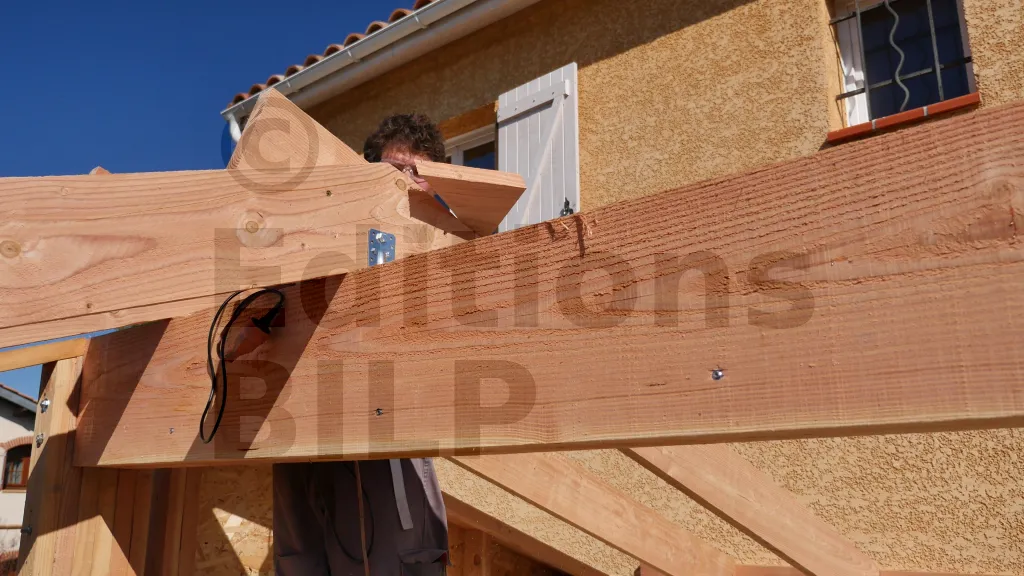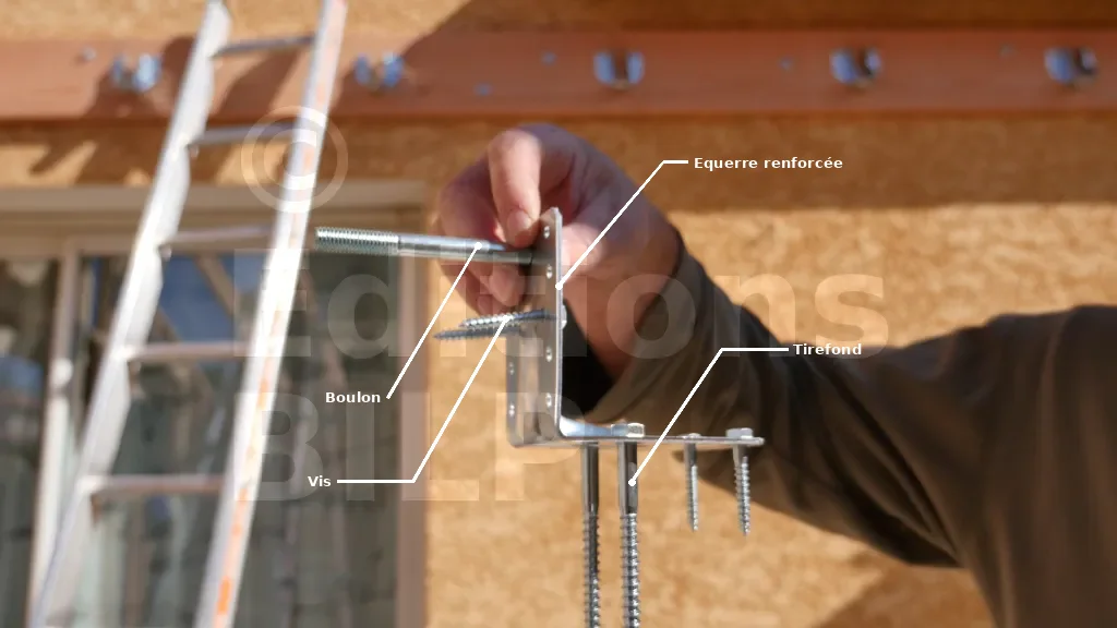 Sur les pannes, l’équerre est fixée à l’aide de tirefonds. Sur les chevrons, la fixation se fait par boulonnage (avec un boulon) et par vissage (avec des tirefonds).