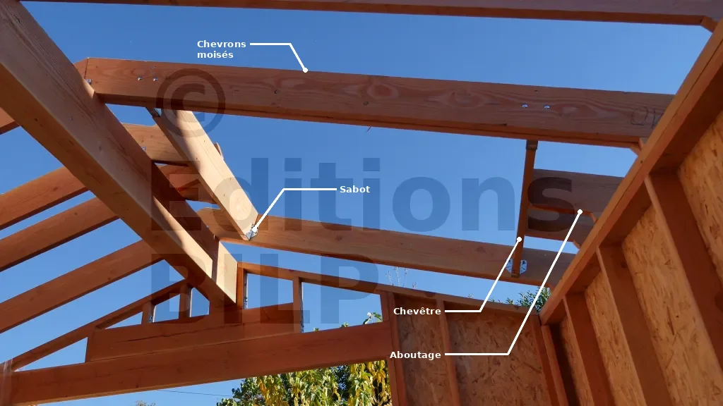 Les aboutages sont fixés au chevêtre à l’aide de vis. Les chevêtres sont soutenus par des chevrons moisés grâce à des sabots. Les chevrons sont moisés pour renforcer la solidité. En effet, les aboutages s’appuient sur les chevêtres, qui à leur tour s’appuient sur les chevrons. Ces deux chevrons supportent donc toutes les charges sur cette zone, ce qui explique leur moisement.