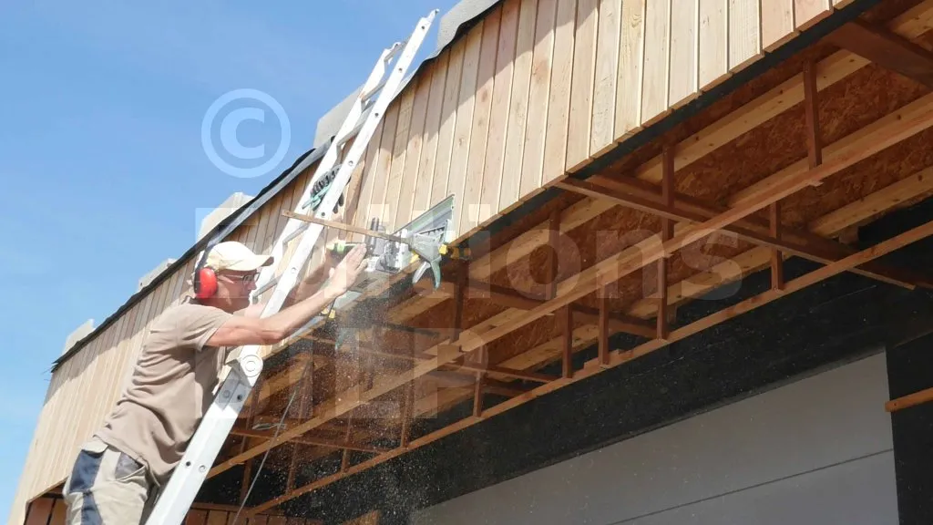 Sur ce grand auvent, des spots encastrables sont prévus pour l’éclairage devant le garage. Les réservations doivent être réalisées dans les planches.