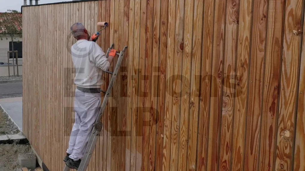 Appliquez une peinture comme traitement protecteur contre les intempéries et les rayons UV sur les bardages pour en prolonger la durabilité. Assurez-vous que la surface du bardage est lisse pour une meilleure adhérence de la peinture. Dans notre cas, nous avons déjà effectué le rabotage du bardage avant sa pose (voir les étapes préparatoires).