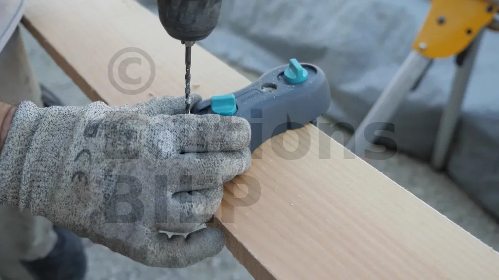 Afin de ne pas abîmer les lames lors du vissage, il est recommandé de pré-percer le bois. Pour plus de précision, utilisez un guide de perçage afin de positionner correctement les points de fixation du bardage. Cette première lame servira ensuite de référence pour reporter avec exactitude les points de fixation des lames suivantes.