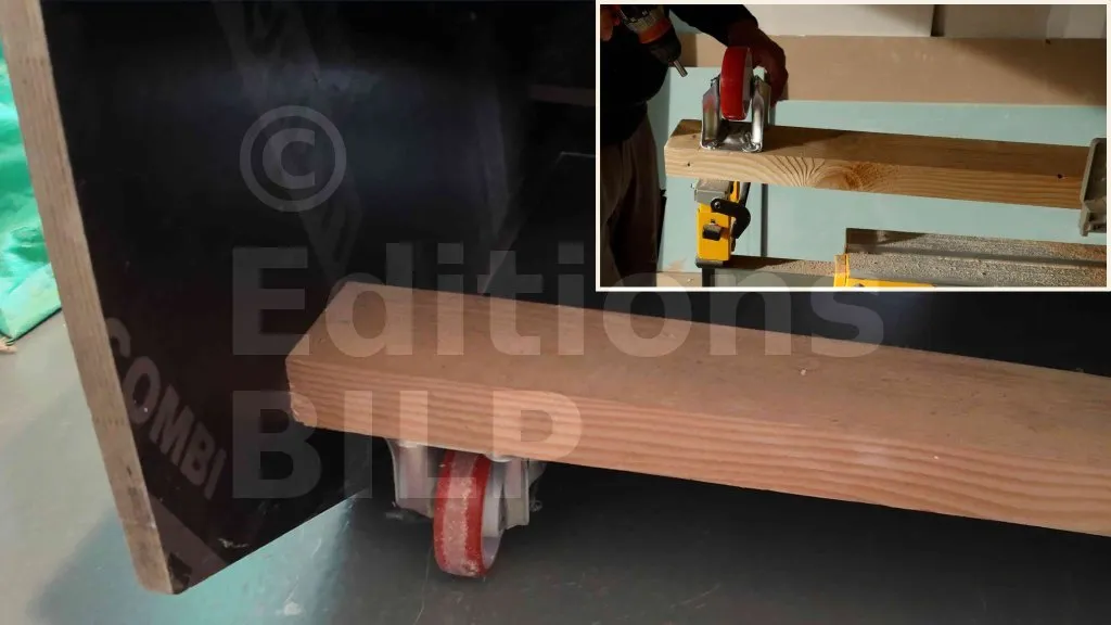 Les roulettes sont d’abord vissées sur une entretoise en bois d’ossature.
