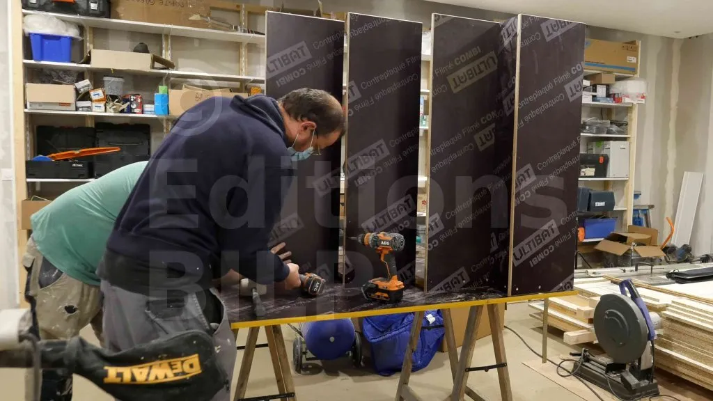 Vu que l’escalier n’est pas fixe et que l’espace où il sera posé est assez étroit, nous avons choisi de le réaliser dans notre atelier afin de disposer de plus d’espace de travail et d’éviter les allers-retours lors des coupes.