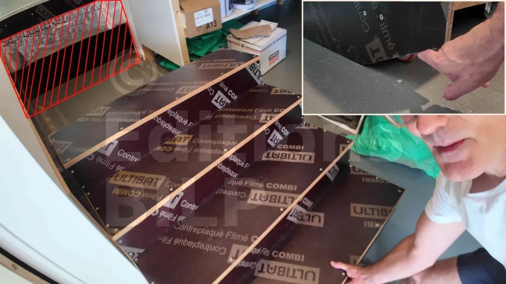Le regroupement de l’escalier avec l’accès à la cave impose une conception permettant soit un démontage ponctuel de la volée pour libérer le passage, soit une structure assez légère pour être déplacée. L’option retenue consiste à réaliser la volée en panneau de coffrage en contreplaqué bakélisé, matériau conciliant robustesse et rapidité de mise en œuvre (surface dense et régulière, bonne tenue à l’humidité incidente, entretien simple). Une fois assemblé, l’ensemble forme un caisson rigide et relativement lourd ; pour en faciliter le déplacement, des roulettes seront intégrées à l’arrière.