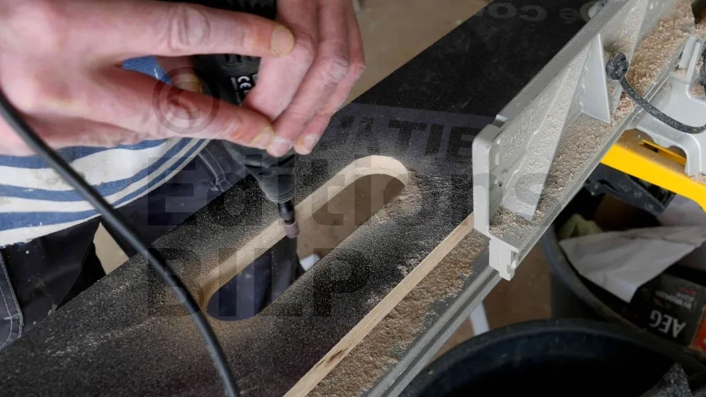 Le passe-main se fait sur la première contremarche. Tracez l’emplacement au milieu. Bloquez la pièce sur des tréteaux. Posez le gabarit et serrez-le. Faites l’ouverture avec la défonceuse équipée d’une fraise à copier. Retirez le gabarit, enlevez les bavures. Poncez avec une ponceuse à tambour pour arrondir les bords, puis faites un ponçage fin. Ajoutez la finition (huile ou vernis) si besoin.