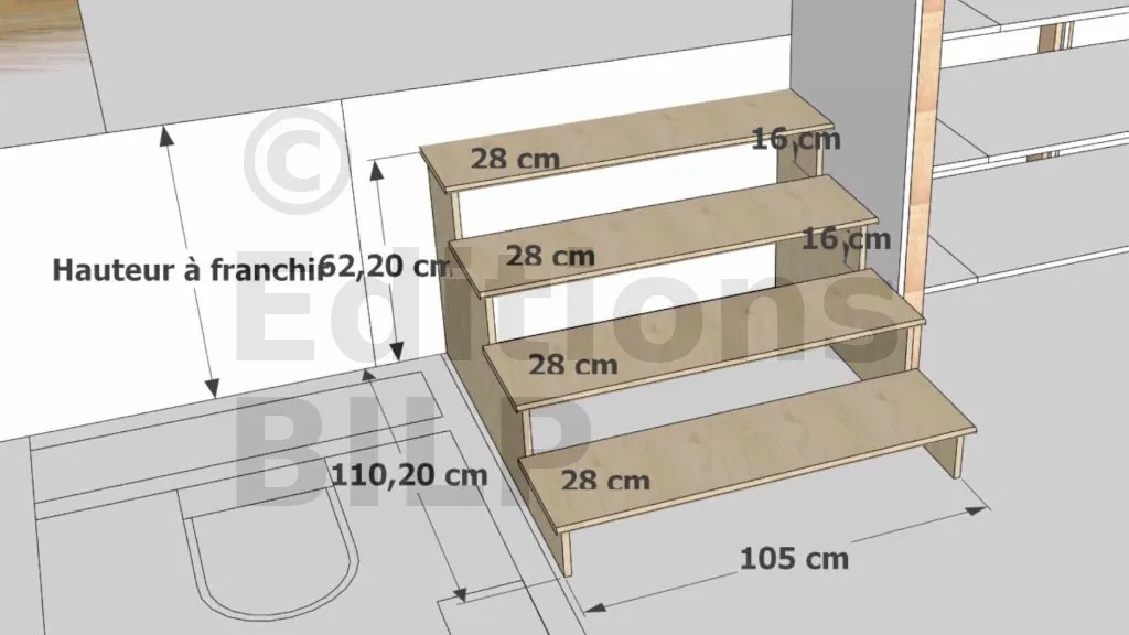 Le caisson comprend deux limons latéraux, des marches, des contremarches et une roulette à l’arrière pour le déplacement. Tous les éléments sont réalisés en contreplaqué bakélisé. Les dimensions géométriques de l’escalier (nombre de marches, hauteur de marche, giron, reculement) sont établies selon la règle de Blondel (2h + g ≈ 63 cm). L’assemblage est effectué par vissage (pré-perçage et fraisage des têtes).