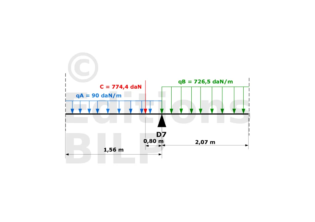 La charge ponctuelle appliquée à la semelle est alors de 2418,7 daN + 2696,375 daN + 552,5 daN = 5667,575 daN.