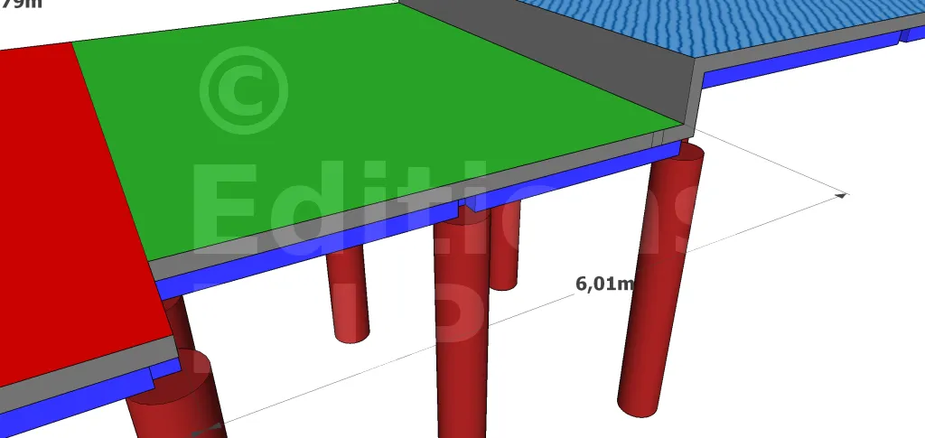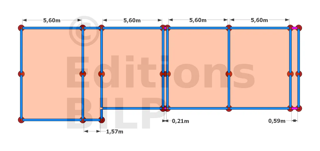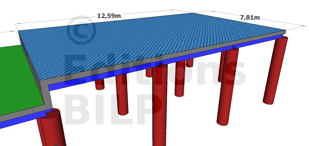 Les longrines sont commercialisées en plusieurs dimensions selon les fabricants. Chez notre fournisseur, la portée maximale pour une longrine de 20 x 20 cm est de 5,00 m, de ce fait la disposition choisie ci-dessus n’est plus réalisable.