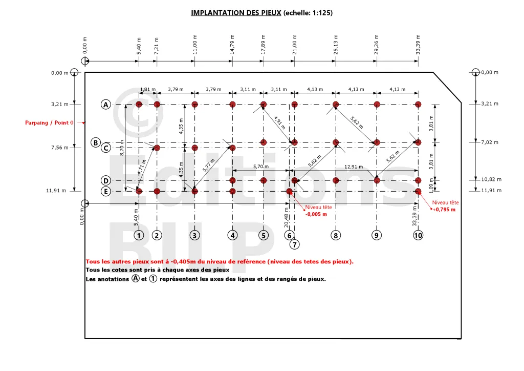 Sur ce plan, les pieux ont été implantés par rapport à la limite du terrain. Les dimensions en diagonales nous serviront à vérifier l’équerrage des axes des pieux.