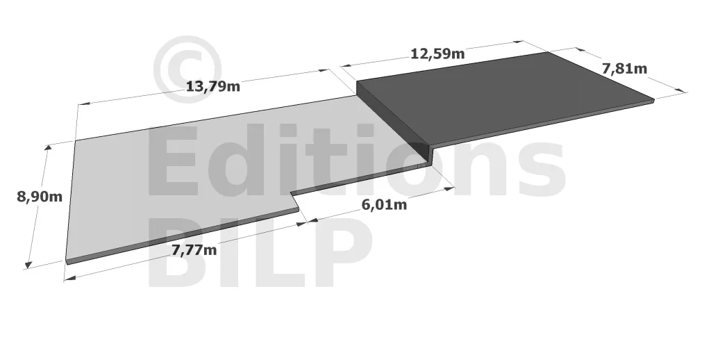 Le plancher a une forme un peu complexe. En effet, l’image ci-contre indique qu’il y a un décrochement à gauche sur une distance de 7,77m, et un changement de niveau sur une distance de 13,79m.