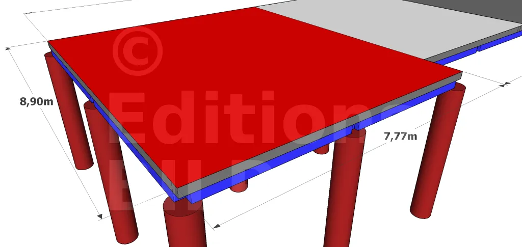 La largeur de 7,77 m et la longueur de 8,90 m sont largement supérieures à la portée maximale de 5,00 m pour une longrine. Alors, nous avons divisé ces distances par deux pour avoir trois pieux avec un entraxe de 4,35 m suivant la largeur du bâtiment, et trois pieux sur lesquels reposent deux longrines de 3,79 m sur la longueur de l’édifice.