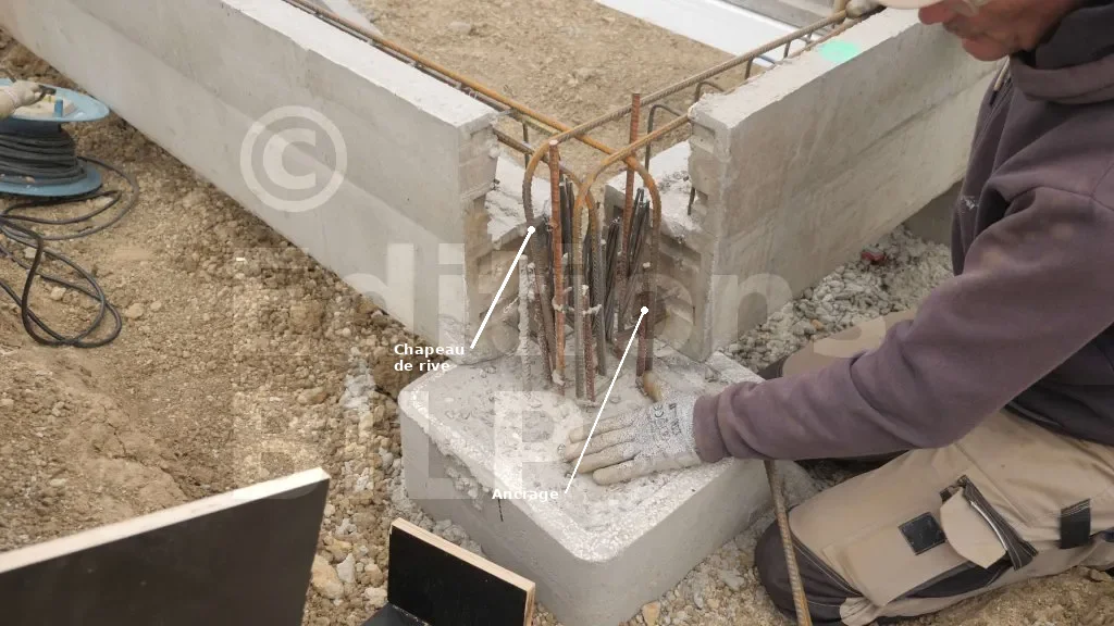 Afin de consolider l’ensemble de la structure des fondations, il est nécessaire de les relier. En effet, les longrines sont connectées aux têtes de pieux à l’aide de fers à béton ancrés dans ces dernières. Ces ancrages ont été installés lors de la réalisation des pieux.