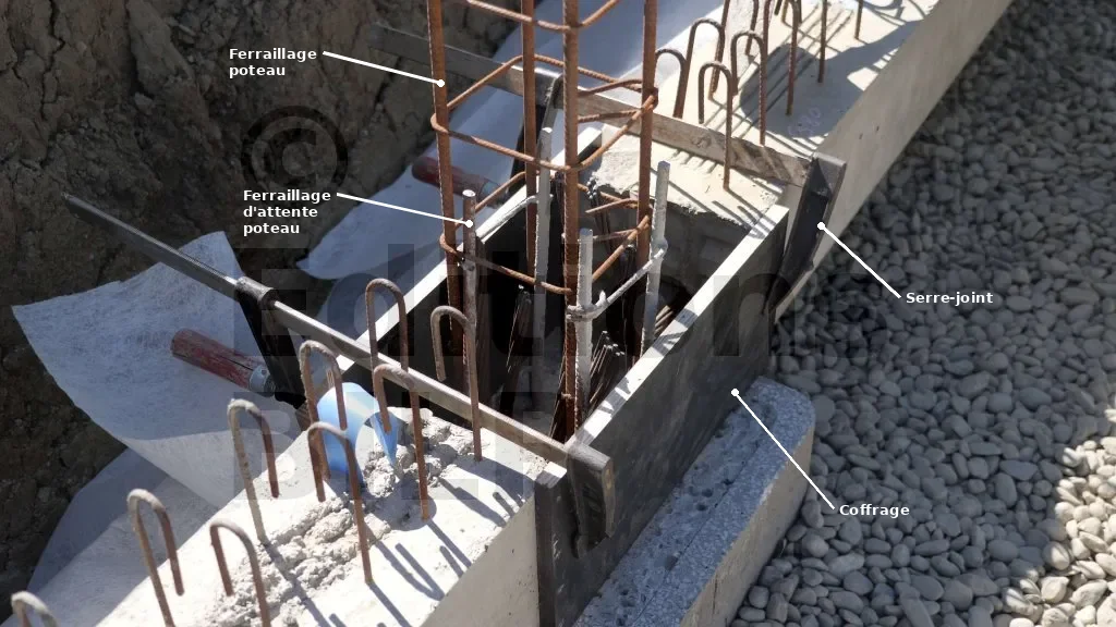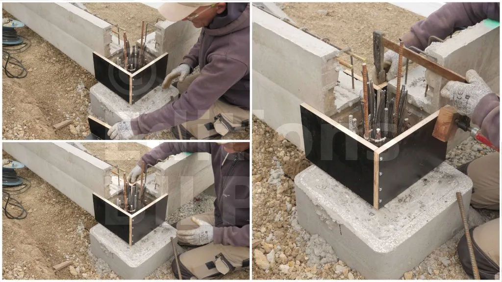 Les coffrages au niveau de ces emplacements sont constitués de deux panneaux de coffrage. Quant à la réalisation, elle est très simple : il suffit de plaquer les deux panneaux contre les longrines. Ensuite, ils sont maintenus en place à l’aide de serre -joints.