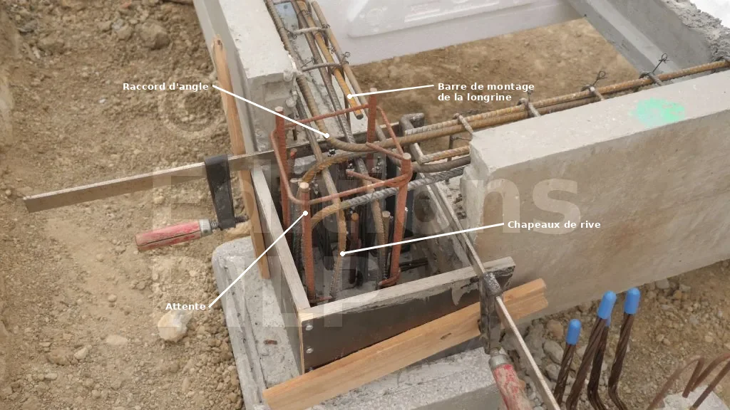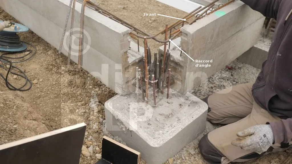 Ce sont des fers à béton en forme de L, utilisés pour assurer la liaison entre les deux longrines. Les raccords d’angle sont fixés aux tirants des longrines (barres de montage). Pour leur mise en place, il est nécessaire de les croiser : un côté du raccord est fixé à la barre de montage intérieure d’une longrine, tandis que l’autre côté est attaché à la barre de montage extérieure de l’autre longrine. Il faut au moins deux raccords sur chaque angle.