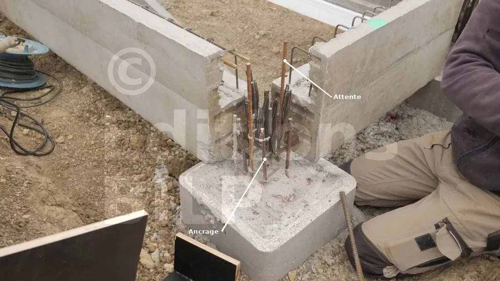 Sur une partie de la structure des fondations de la maison BILP, un mur de soubassement est prévu, intégrant des poteaux en béton armé. Les armatures de ces poteaux doivent être mises en contact avec les têtes de pieux, ce qui justifie l’importance de prévoir des attentes dans les clavetages.