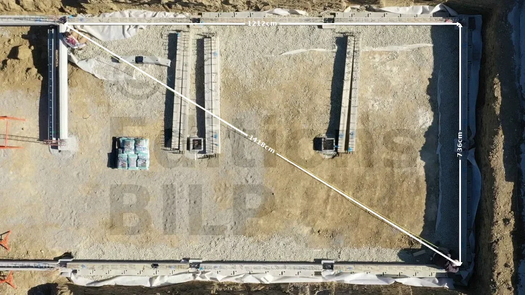 Sur notre chantier, nous disposons seulement d’un décamètre et d’un smartphone (calculatrice). Ainsi, avec ces moyens, nous avons appliqué le théorème de Pythagore (la méthode la plus fiable). Selon lequel, la diagonale est égale à la racine carrée de la somme des carrés de la longueur et de la largeur : √(L²+l²). Sur le projet, la largeur (l) fait 736 cm, la longueur (L) 1 212 cm et la diagonale (D) 1 418 cm.