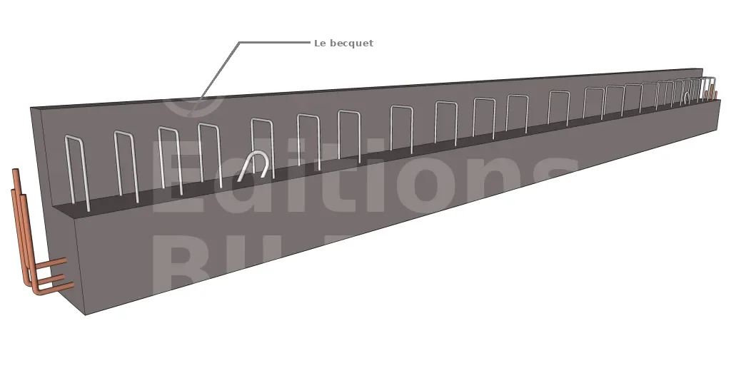 Il s’agit de longrines positionnées le long des bords d’un plancher. Elles ont une forme rectangulaire, avec une partie saillante appelée becquet, servant de coffrage périphérique pour la dalle de compression. Les aciers principaux et transversaux sont préfabriqués en usine, tandis que les armatures de montage doivent être installées sur le chantier. Pour le projet Maison BILP, les deux types de longrines sont utilisés. Vous pouvez également consulter l’article sur la Vérification des longrines si vous souhaitez savoir comment nous avons vérifié la section des longrines.