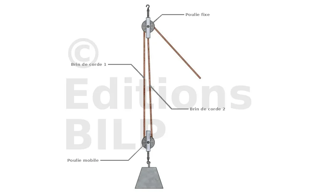 Sur ce système, on utilise deux poulies : l’une est fixe et l’autre mobile. Le fonctionnement est similaire à celui d’un palan, mais le système se trouve dans un seul boîtier. La force fournie par l’utilisateur est multipliée par le nombre de brins de corde : avec deux poulies, il y a deux brins de corde, ce qui signifie qu’il faut fournir 250 Newton (25 kg) pour soulever un plot de 50 kg, au lieu de 500 Newton (50 kg) avec une seule poulie.